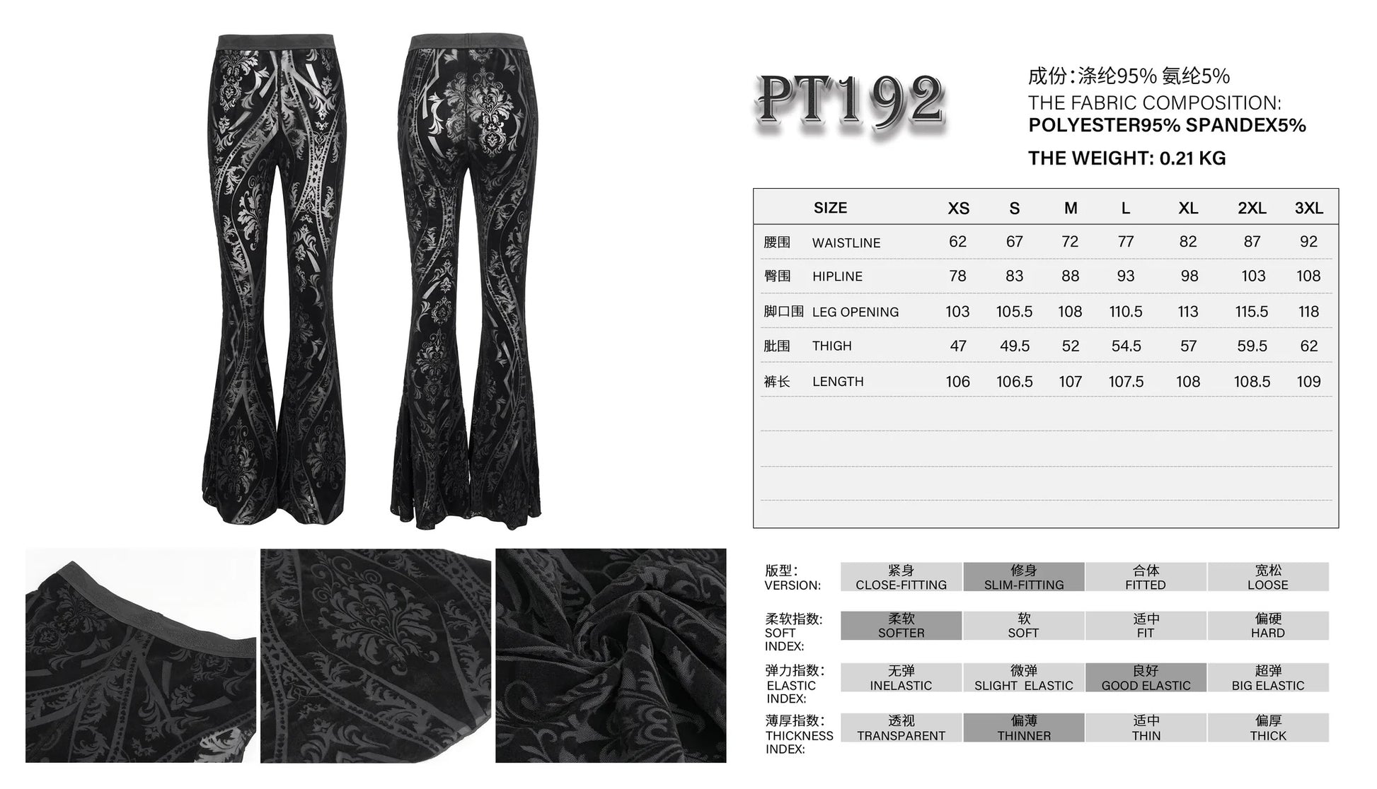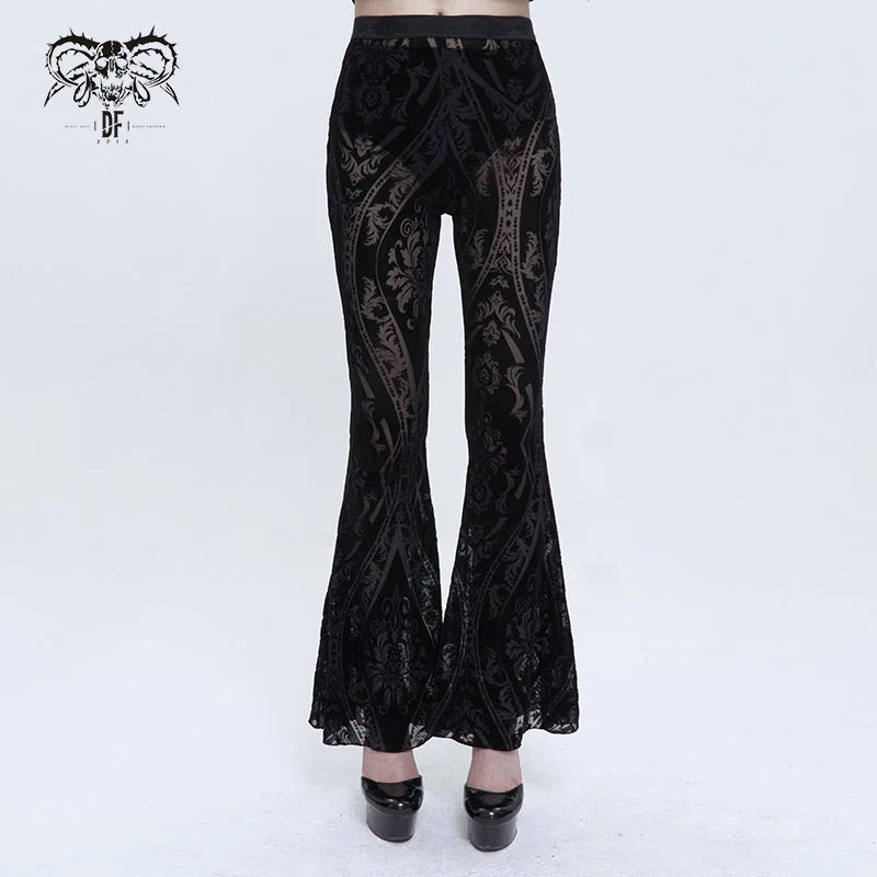 A pair of Patterned Mesh Flared Pants. These pants feature an elastic waistband and flared legs. The fabric is printed and elastic. Product specifications:Style: GothicMaterial: POLYESTER 95%, SPANDEX 5%