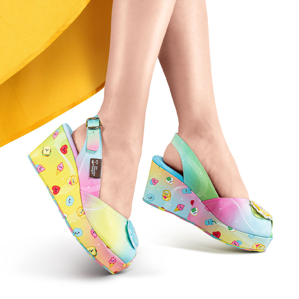 Walk on Sunshine and Style with our Chocolaticas® Picnic Women’s Sandal. These sandals are the epitome of comfort and style, perfect for any sunny day out. These shoes feature a soft pastel color palette fabric with blue, green, yellow, and a dash of pink, adorned with cute characters, such as hearts, sweets, and a vibrant sun with summer shades. The interior is also made of soft fabric and a cushioned inner sole for support and comfort.