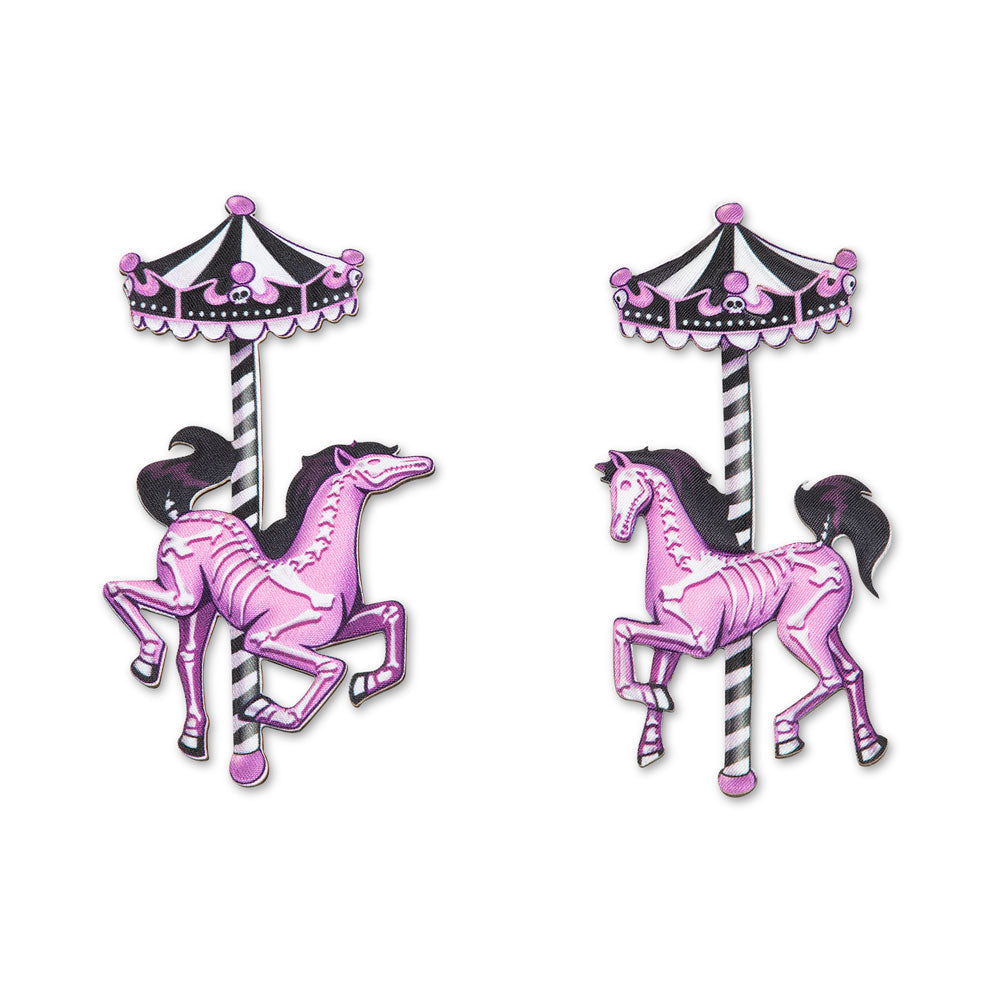 • Striking carousel design with skeletal pink horses and bold purple details