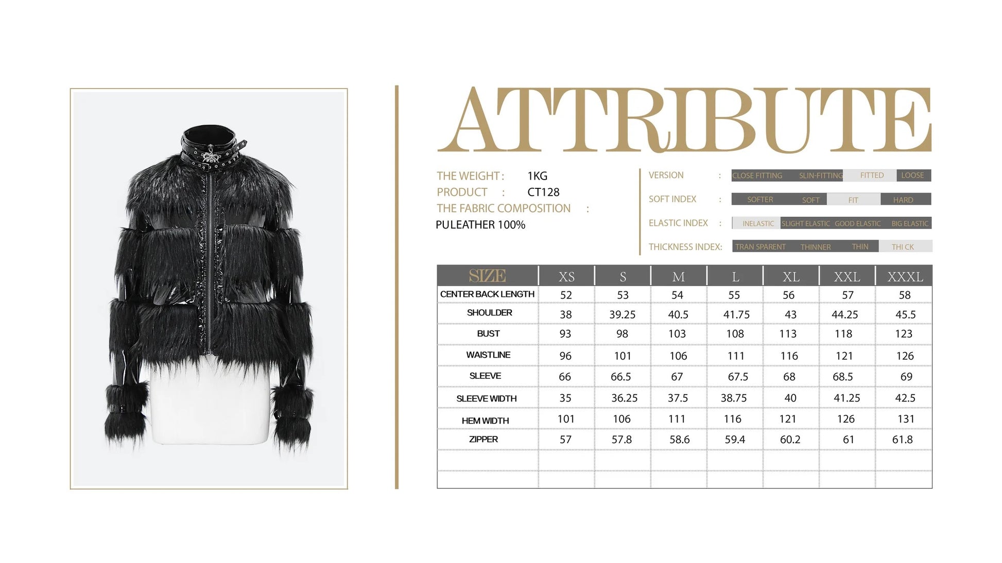 A unique faux fur and PU leather punk jacket that will help you express yourself better and reject conformity!Keep yourself warm with this edgy jacket that features a turtleneck neckline with buckled leather straps and an exclusive devil fashion zipper slider.