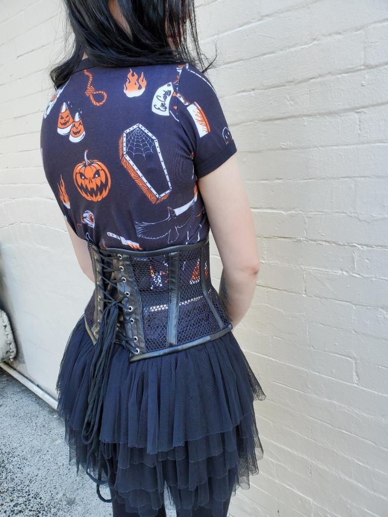 Every spooky babe needs a signature corset in their closet and this is the perfect one! Nothing goes better with every outfit better then traditional fishnet.