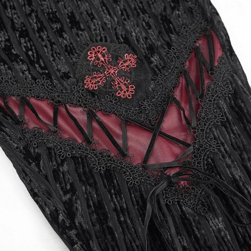 Gothic lace crucifix bell-bottoms. Details include distressed cutouts on thighs that are embellished with lace and crucifixes on both sides. Elastic waistband. Product Specifications:Style: GothicFabric: 70% Polyester, 30% Rayon