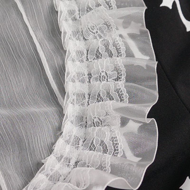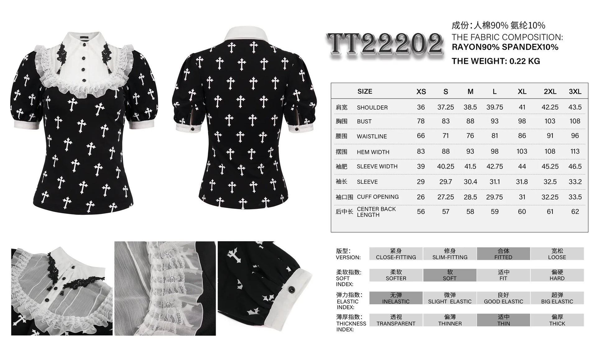 A Gothic Crucifix Patterned Printed Top. It features a high collar, short bubble sleeves and printed fabric. The neckline is bordered with lace and buttons. Product specifications:Style: GothicMaterial: RAYON 90% SPANDEX 10%