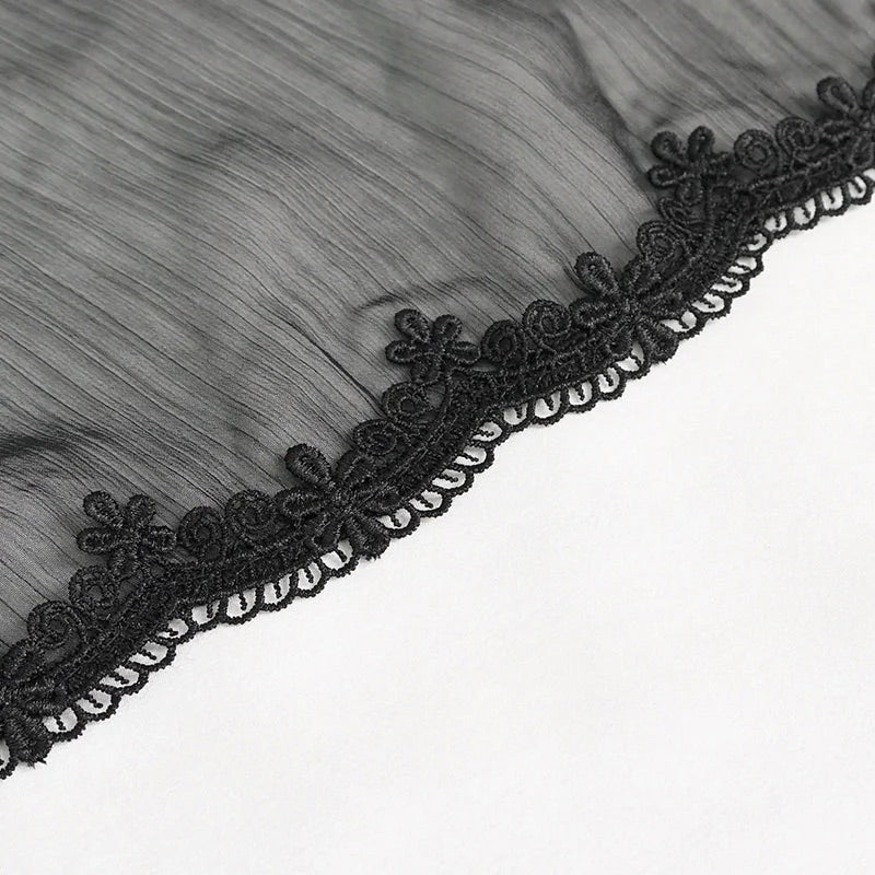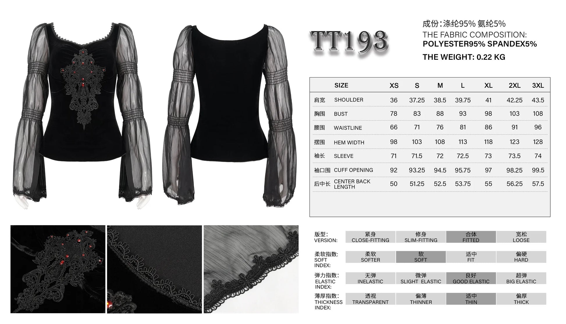 A Gothic Velvet Top.It features mesh lantern sleeves and a square neckline.The centre front is decorated with appliqued lace motif.The cuffs and the neckline are bordered with minimalistic gothic lace. Product specifications:Style: GothicMaterial: POLYESTER 95%, SPANDEX 5%