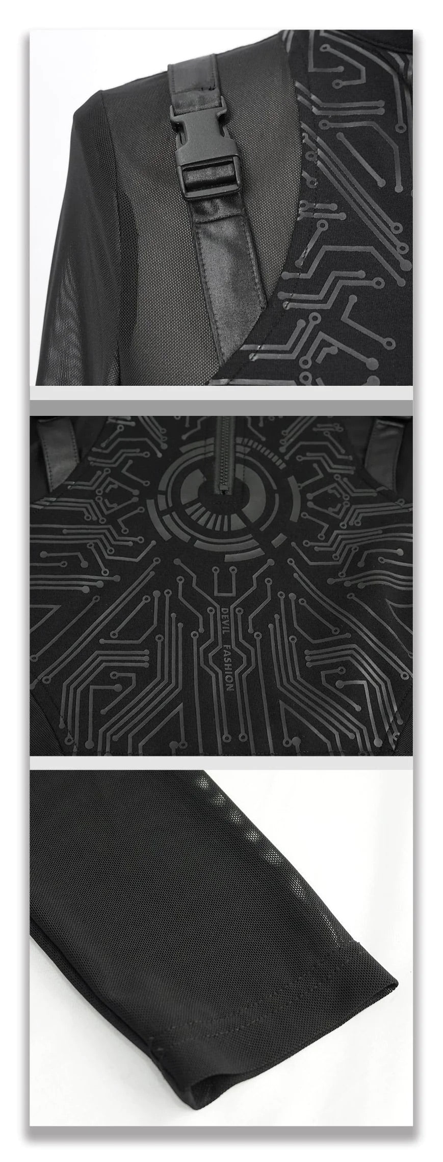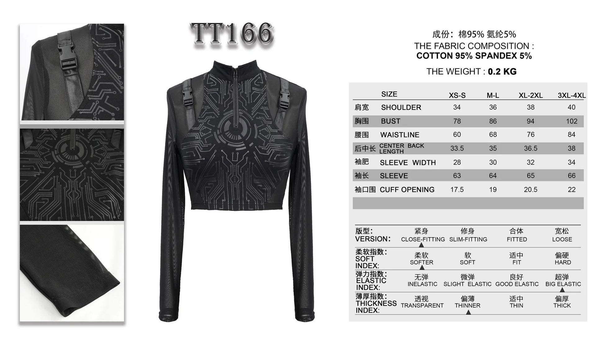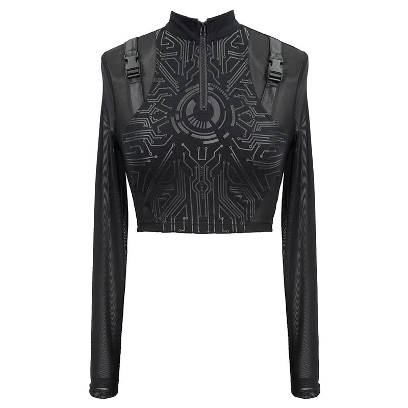 A futuristic cyberpunk crop top featuring influences from the fashion of several decades of the last century and many subcultures.The applique pattern represents the cyberpunk aesthetic amazingly and the mesh sleeves add a hint of sexiness to it.The buckles on the shoulders can be unfastened and fastened.