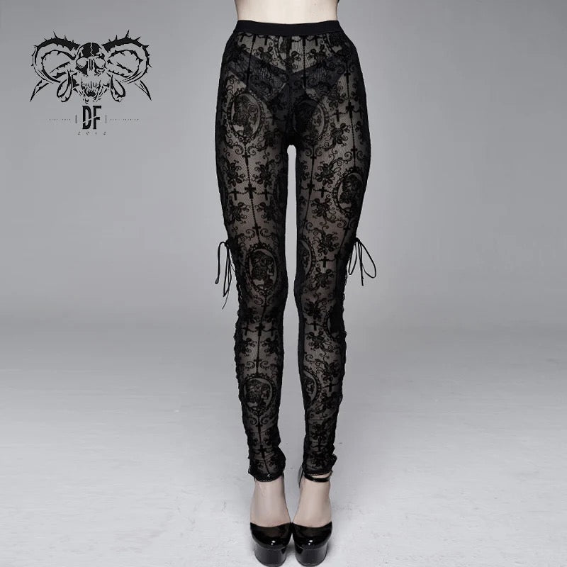Elegant yet dark, classy yet sexy, coquettish and vivacious, these gothic leggings are perfect for all of us who love all things bold and gothic!This leggings is sheer with a tasteful pattern and lace up slits which can be undone and tied whenever required.The waist is elastic too.