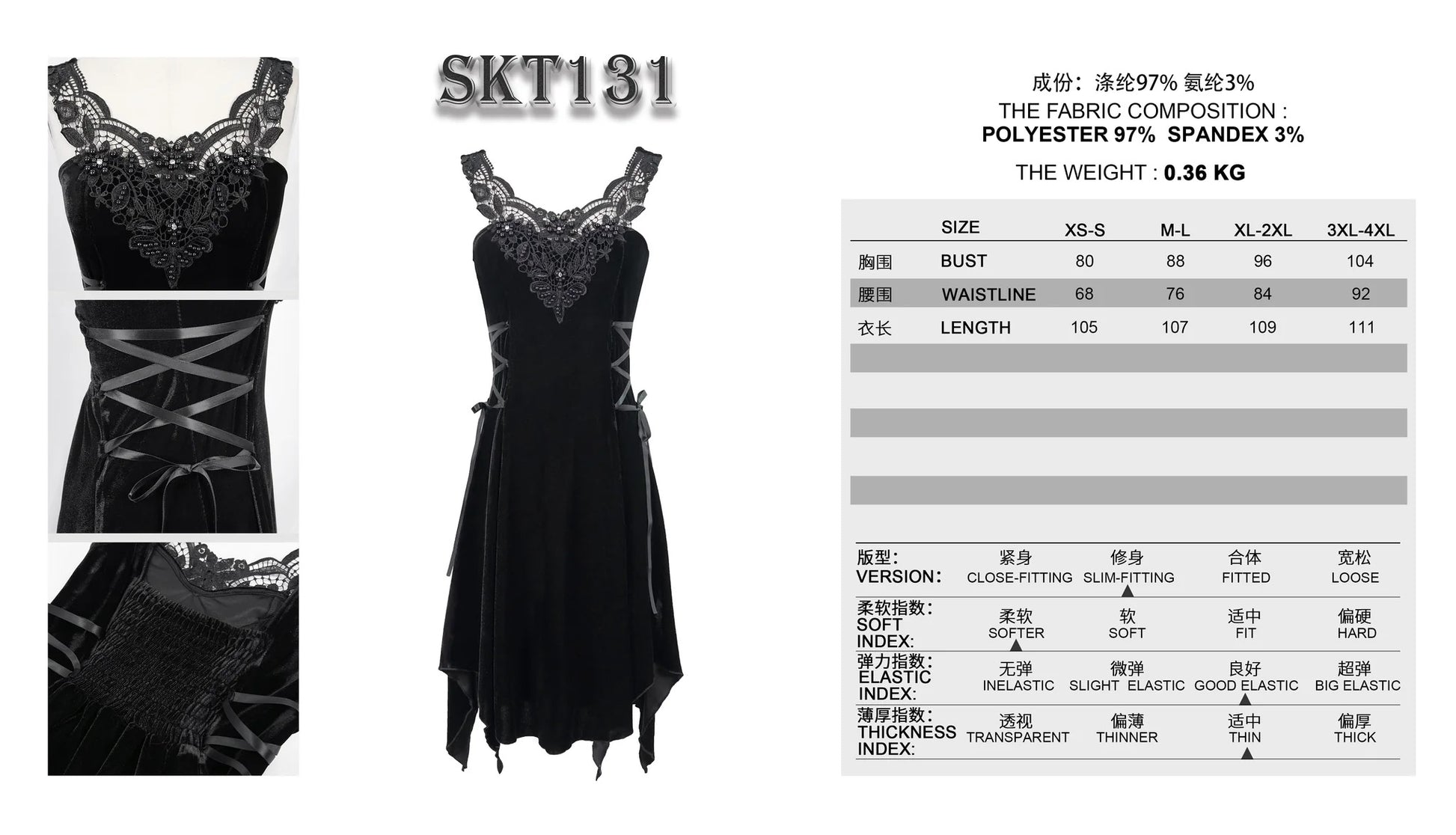 A gothic dress with distressed hemline. The neckline is entirely made out of lace and embellished with beads. The corset inspired back is adjustable. Product Specifications: Style: Gothic  Fabric: Polyester 97%,  Spandex 3%