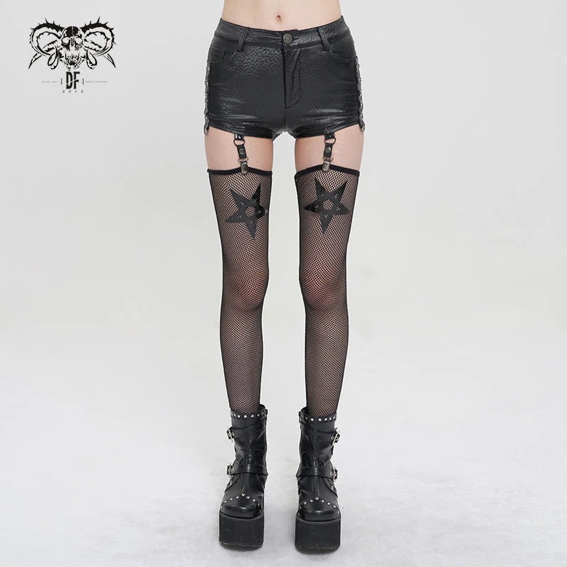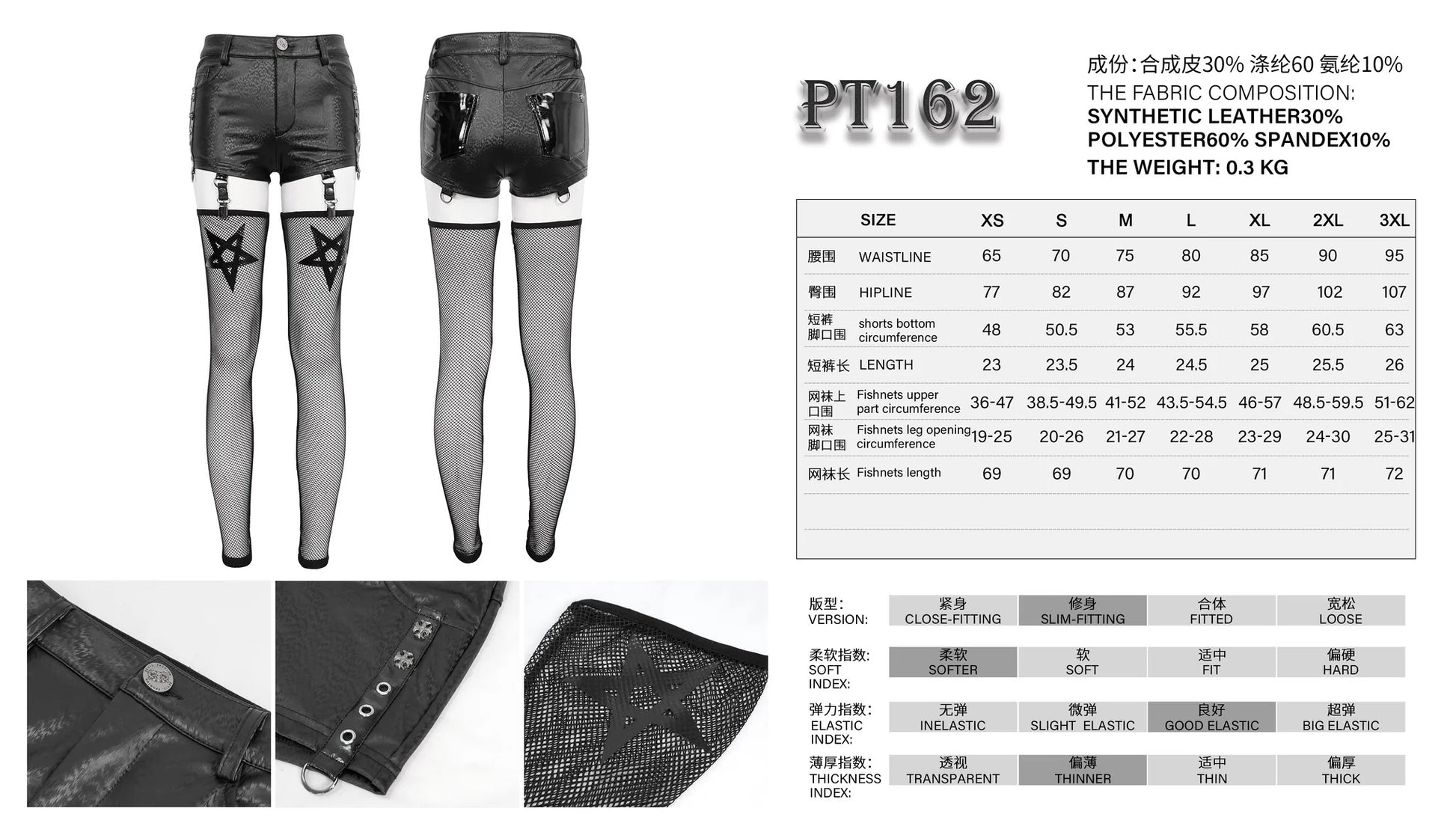 A pentagram stockings punk pants. It features stockings with pentagram star that can be detached from the piece with the help of clips on the hemline. The shorts are stretchable. Product specifications: Style: PunkMaterial: Synthetic Leather 30%, Polyester 60%, Spandex 10%