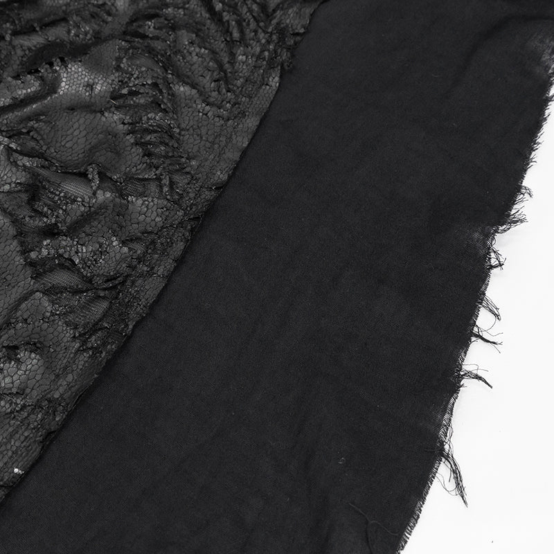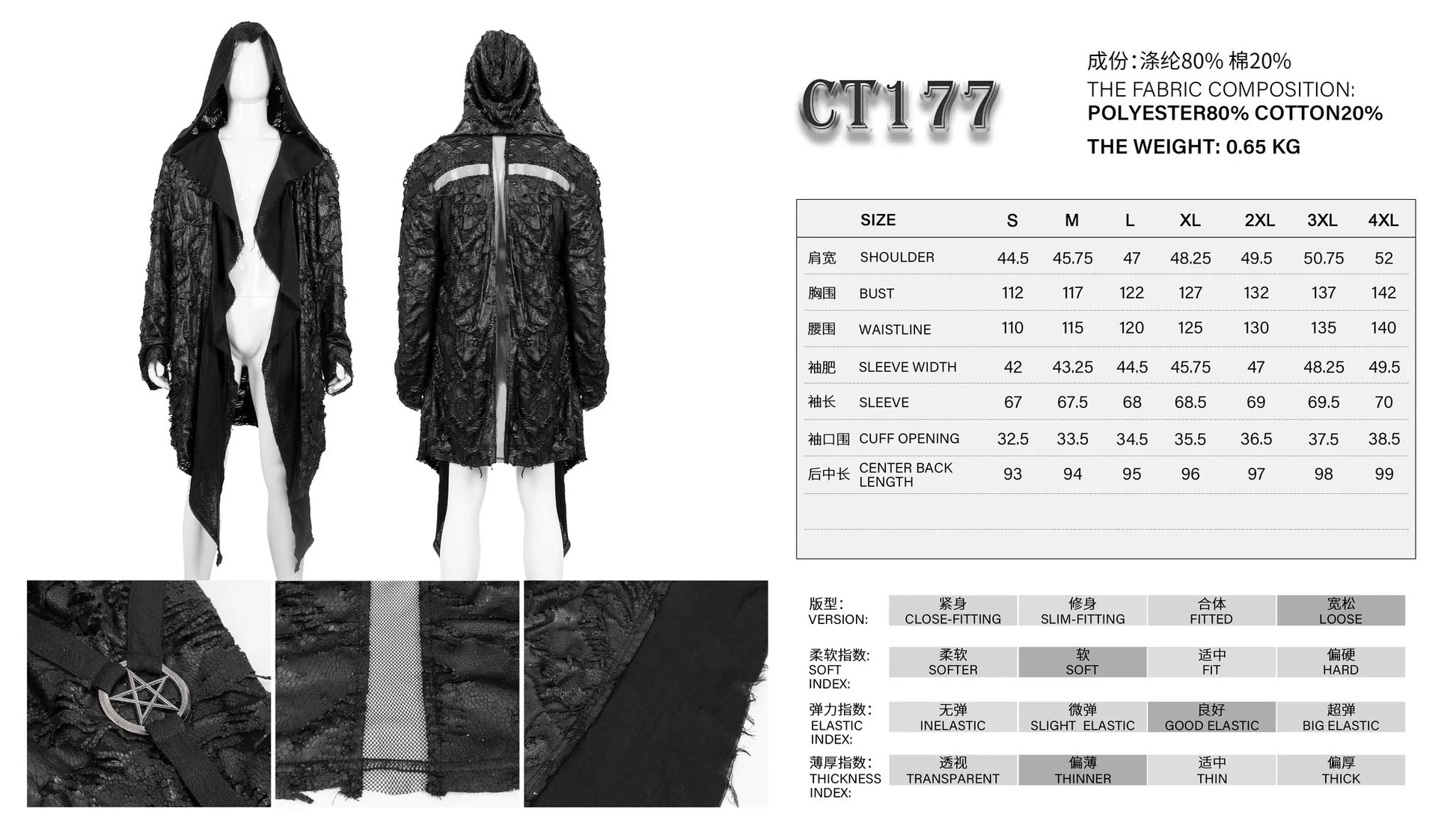 A punk cape with pentagram brooch. It features distressed texture, a hood and an asymmetrical hemline. The fabric is lightweight and there is a mesh panel at the back.