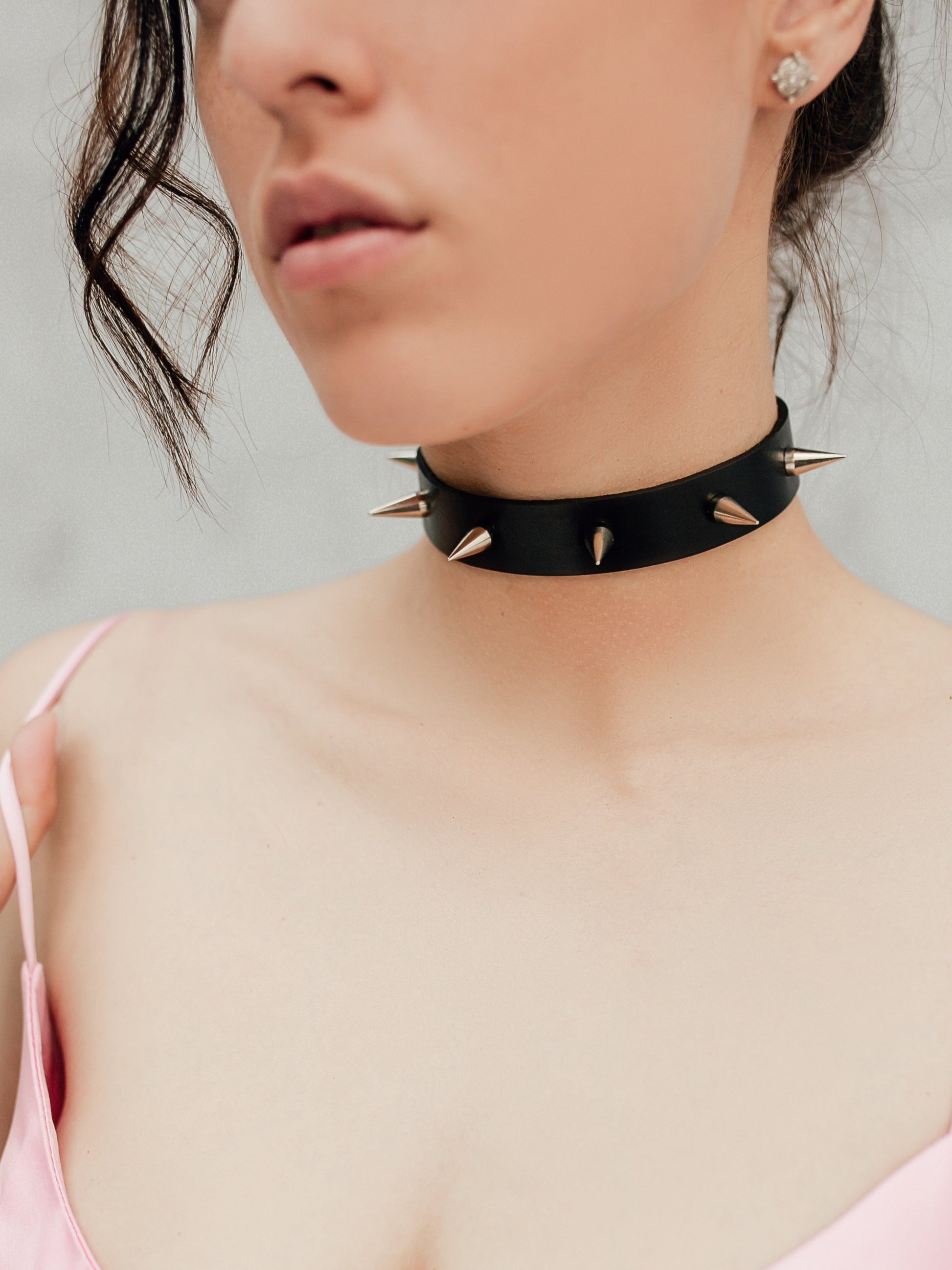This stunning choker is a must-have accessory for any rebel at heart. Featuring spike hardware it's the perfect way to add a touch of edginess to your outfit. With a comfortable width of 0.6-inch (1.5 cm), it's both elegant and practical. Let your inner rebel shine with this bold and daring accessory.