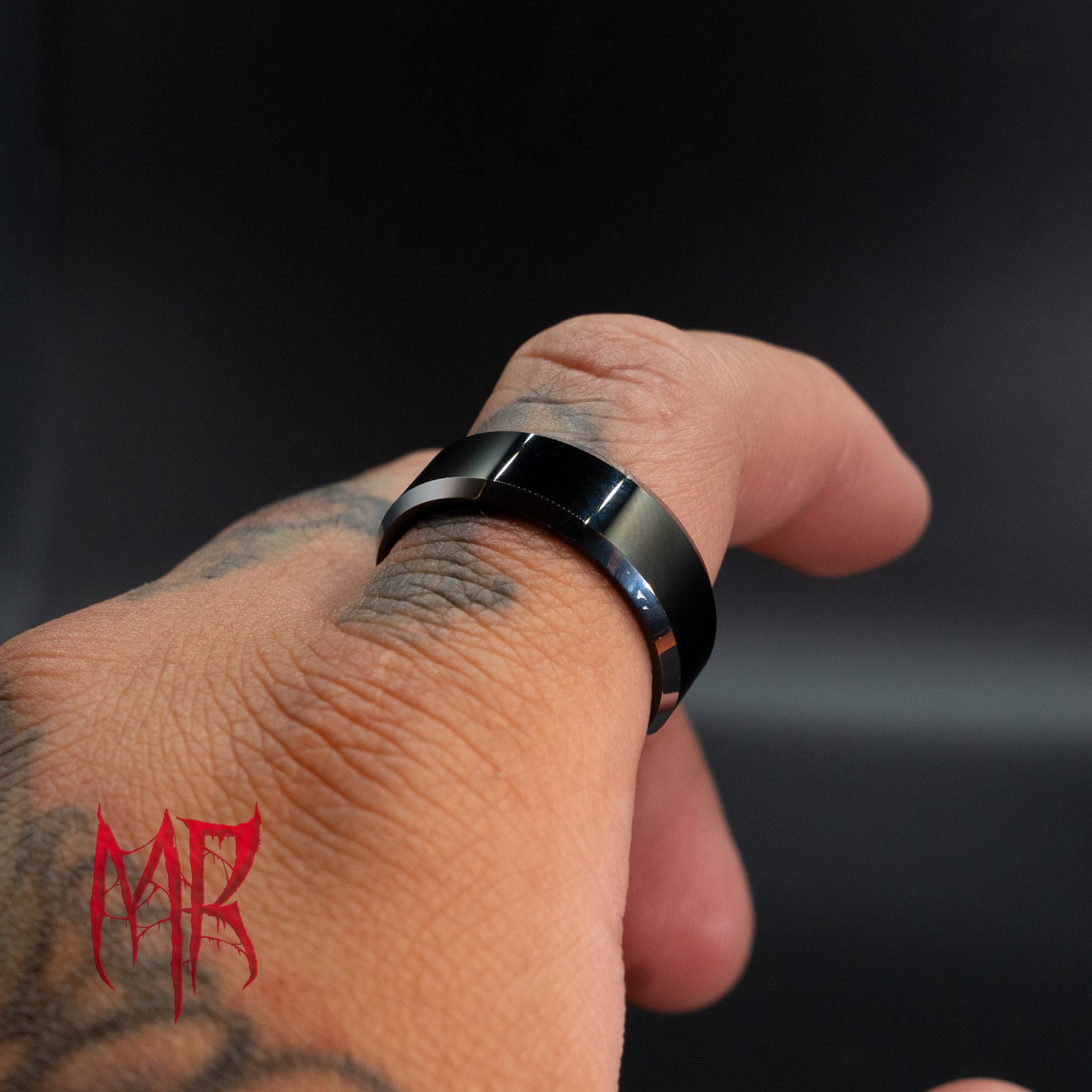 The Titus Tungsten Ring is crafted from robust tungsten. The Titus Ring has a scratch-resistant surface ensuring a long-lasting durability while maintaining its shine for years to come. This bad boy is heavy, and rightfully so. It's built like a mini tank. You'll feel naked without it, you'll know when it's not on and you'll miss that quality weight it has. It comes in black with metal showing on the edges. This ring is built to last.