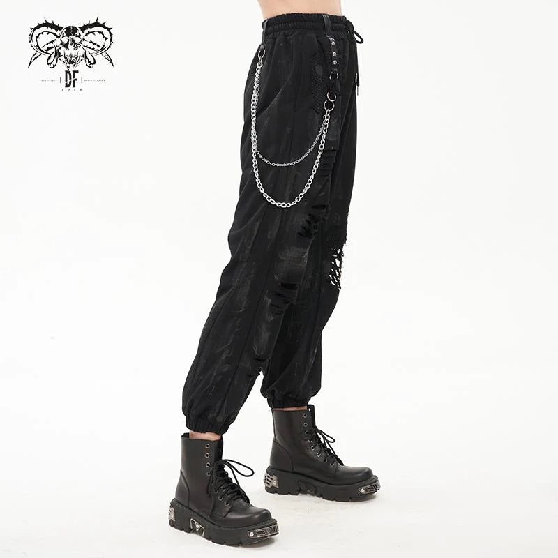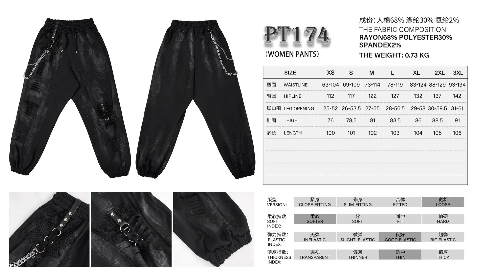 Distressed punk cargo pants. The fabric is textured and there is a chain alongside an asymmetrical mesh panel on one side while the other side sports buckles. The waistband is elastic and can be cinched with the help of the drawstring. Product Specifications: Style: Punk Fabric: Rayon 68%, Polyester 30%